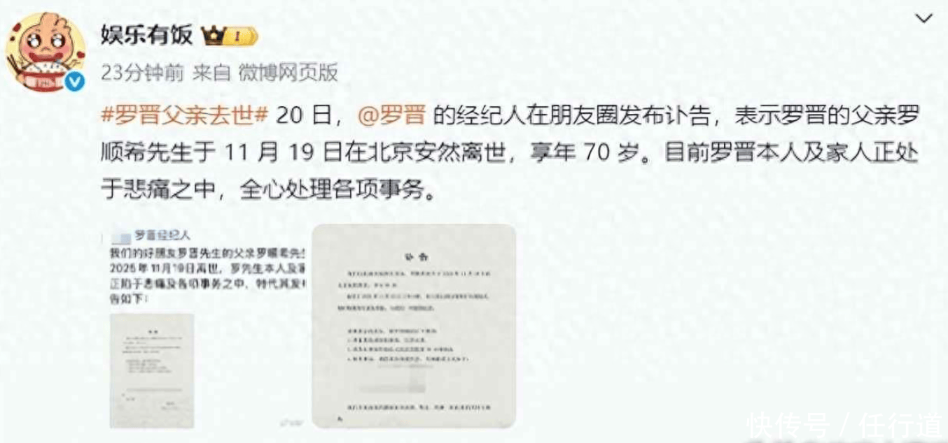 11月20日,娱乐圈传来一则令人唏嘘的消息:演员罗晋的父亲罗顺希先生于北京不幸离世,享年70岁。